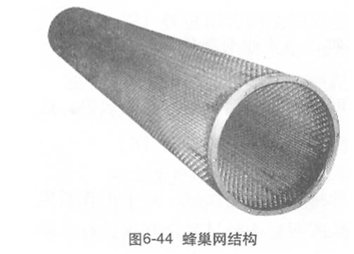 轉(zhuǎn)鼓設(shè)計(jì)上采用了蜂巢網(wǎng)結(jié)構(gòu)(圖6-44),為國(guó)內(nèi)首例。這種結(jié)構(gòu)提高了剛性,同時(shí)開孔率高達(dá)90%,最大限度地降低了能量消耗。表面的反彈網(wǎng)采用了鎳網(wǎng),增強(qiáng)了水刺的反彈能力,提高了纖維的纏結(jié)效果。