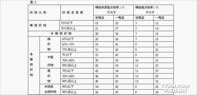 1 主題內容與適用范圍 本標準規定了大提花棉本色布的產品品種、規格、技術要求、布面疵點的評分、試驗方法、檢驗規則和標志、包裝。 本標準適用于鑒定機織大提花棉本色布的品質。 2 引用標準 GB 3923 機織物斷裂強力和斷裂伸長的測定(條樣法) GB/T 406 棉本色布 GB 4666 機織物長度的測定 GB 4667 機織物幅寬的測定 GB 4668 機織物密度的測定 FZ/T 10004 棉及化纖純紡、混紡本色布的檢驗規則 FZ/T 10006 棉及化纖純紡、混紡本色布棉結雜質疵點格率檢驗 ZB W04 006.2 溫度與回潮率對棉及化纖純紡、混紡制品斷裂強力的修正方法 本色布斷裂強力的修正方法 ZB W08 002 棉及化纖純紡、混紡本色布包裝和標志 3 產品品種、規格 大提花棉本色布的品種、規格,根據用戶需要,由生產部門按技術條件的規定制訂。 4 技術要求 4.1 技術要求項目 技術要求項目有織物組織、幅寬、密度、斷裂強力、棉結雜質疵點格率、棉結疵點格布面疵點七項。 4.2 分等規定 4.2.1 大提花棉本色布的品等分為優等品、一等品、二等品和三等品,低于三等品的為等外品。 4.2.2 大提花棉本色布的評等以匹為單位,織物組織、幅寬、布面疵點按匹評等,密度、斷裂強力、棉結雜質疵點按批評等,以其中那個最低一項品等作為該匹布的品等。 4.2.3 分等規定見表1和表2。.jpg)