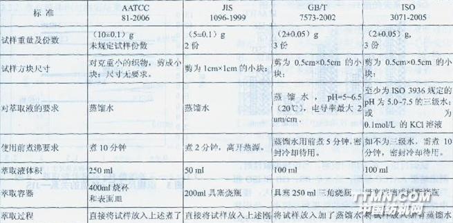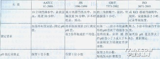 由上表可清楚的看到,四個標準中對織物所要剪裁的尺寸、對蒸餾水的處理及萃取過程均不同,且最終結果保留小數的位數也略有不同。AATCC和JIS用加熱的方式萃取,萃取過程充分快速一些,但也有人認為在室溫下萃取更能模擬紡織品的使用過程,且在ISO 3071—2005中還增加了KCl溶液測定法,以便更接近服用過程。而GB 7573-2002是參考ISO 3071-1980制訂的,未規定KCl溶液測定方法,且測定結果保留2位小數。日標JIS 1096-1999規定紡織品pH值測定方法有兩種,多數紡織品參考ISO3071-1980,而在表1所述的方法主要用于羊毛織物pH值的測定。生態標準Oeko-Tex standard 100 2009中pH值的測定標準執行ISO 3071。在2008年8月19日發布的《GB 7573紡織品水萃取液pH值的測定》(征求意見稿)中,修訂參照了ISO3071—2005,技術指標與ISO 3071-2005相同。