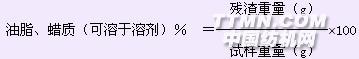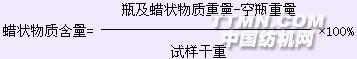 3. 四氯化碳萃取法(1)主要儀器和化學品 脂肪萃取器、恒溫水浴鍋。四氯化碳(C.P.)(2) 步驟 稱取經剪碎并預先在105℃烘箱中烘至恒重的試樣10g(精確到0.0001g)。將試樣放在特制的紙筒或以濾紙做成的紙筒中,紙筒置于脂肪萃取器中,筒的高度應高于萃取器虹吸管的上端1-1.5cm,而試樣在濾紙筒中的高度以低于虹吸管頂端1-1.5cm為宜。在脂肪萃取器的燒瓶中加入120mL四氯化碳,并置于恒溫水浴中,調節溫度,保持溶劑每小時虹吸循環3-4次,萃取3h后冷卻,將萃取器燒瓶中含有蠟狀物質的萃取液濾入已知重量的三角瓶中。將萃取器的燒瓶、濾紙及漏斗用溶液洗3次,在水浴上加熱蒸餾。待溶劑全部蒸出后,再將三角瓶置于烘箱中,于105℃溫度烘至恒重,在干燥器中冷卻后精確稱重。(3) 計算
