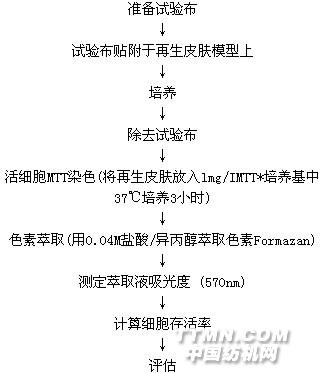 三、再生皮膚刺激性試驗法 抗菌整理紡織品對人體皮膚刺激性試驗,改由人皮細胞培養(yǎng)成再生皮膚模型上進行,以計算細胞存活率作為刺激性評估,其方法概要如下: