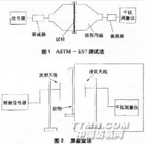 1 織物屏蔽效能的測試目前對織物屏蔽效能的測試一般采用平面材料的電磁輻射屏蔽效能的測試方法,常用的有:ASTM— ES7 測試法