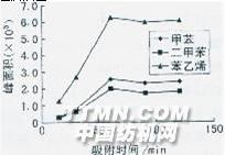(2)吸附時間 SPME的吸附速度主要由待測組分從固相到萃取相的質量轉移過程決定。其中包括待測組分從固相傳遞到萃取相表面,及從萃取相表面擴散至其內部兩個階段。由于萃取相厚度僅100μm,后一過程在1 min內即可完成,故SPME的吸附速度受前一過程制約。由圖4可見,苯乙烯、甲苯、二甲苯在60 min左右可達到平衡。