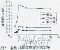 圖4吸附時間對峰面積的影響 (3)脫附時間 吸附后,隨即將SPME萃取相插入氣相色譜進樣口內,進行熱脫附,氣化室溫度的設置因樣品而異,本試驗中,設置為200℃。隨萃取相溫度上升,待測組分因其兩相分配因數迅速下降而自萃取相逸出,載氣的通入,更加速了脫附過程。試驗數據表明,在2 min內脫附已完成,延長萃取相停留時間,無助于效果的改善.見圖5。