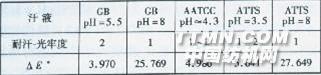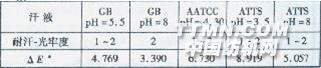 *ΔE是在染料曬至變色時測得的,照射時間為4 h。 由表8可以看出,活性嫩黃M-7G,各汗液標準下耐汗-光牢度均不高。測試前后色差值(△E)大小關系為:ATTS(pH=8)>GB(pH=8)>ATTS(pH=3.5)>AATCC>GB(pH=5.5)。堿性條件下測試后試樣幾乎露出白色。活性嫩黃M-7G的嚴重光汗褪色與其染料母體結構和雙活性基密切相關。3 結論3.1測試方法。同一染料同一汗液標準下采用GB/T14576--1993 A法比采用B法所得結果較高。這揭示了氧氣參與染料的光汗反應。耐汗-光牢度,體現的是染料抵抗光、汗液、氧氣三者共同作用的能力。