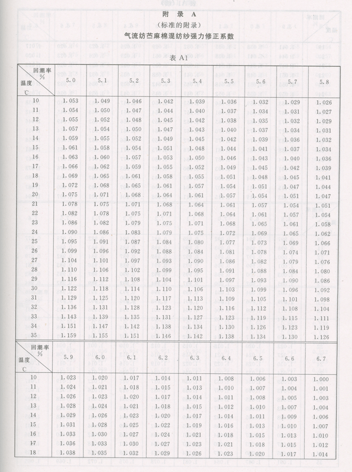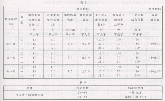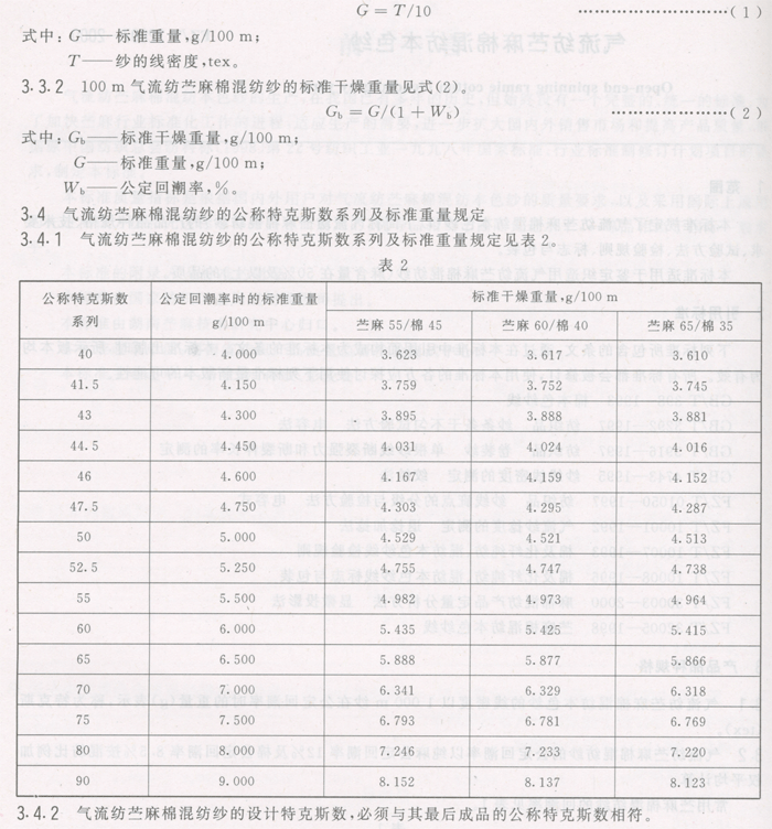 | 前言 氣流紡苧麻棉混紡本色紗的生產,在我國已有多年的歷史,但始終沒有一個完整的、統一的標準。為了加快苧麻行業標準化工作的進程,適應生產的需要,進一步擴大國內外銷售市場和提高產品質量,根據原中國紡織總會紡科標[1998]第22號紡織工業一九九八年國家標準、行業標準制修訂計劃項目的要求,制定本標準。 本標準質量指標是根據國內外用戶對氣流紡苧麻棉混紡本色紗的質量要求,以及采用國際上通用的先進測試方法和先進標準部分內容而制定的。優等品相當于國際先進水平,一等品相當于國際一般水平。 本標準的附錄A是標準的附錄。 本標準由國家紡織工業局規劃發展司提出。 本標準由湖南苧麻技術研究中心歸口。 本標準起草單位:湖南省紡織產品質量監督檢驗測試中心。 本標準主要起草人:萬紅玲、蔣敏、彭愛葵。 1范圍 本標準規定了氣流紡苧麻棉混紡本色紗(以下簡稱氣流紡苧麻棉混紡紗)的產品品種規格、技術要求、試驗方法、檢驗規則、標志與包裝。 本標準適用于鑒定織造用氣流紡苧麻棉混紡紗(麻含量在50%及以上)的品質。 2引用標準 下列標準所包含的條文,通過在本標準中引用而構成為本標準的條文。本標準出版時,所示版本均為有效。所有標準都會被修訂,使用本標準的各方應探討使用下列標準最新版本的可能性。 GB/T 398—1993棉本色紗線 GB/T 3292—1997紡織品紗條條干不勻試驗方法電容法 GB/T 3916—1997紡織品卷裝紗單根紗線斷裂強力和斷裂伸長率的測定 GB/T 4743—1995紗線線密度的測定絞紗法 FZ/T 01050—1997紡織品紗線疵點的分級與檢驗方法電容式 FZ/T 10001—1992氣流紗捻度的測定退捻加捻法 FZ/T 10007—1993棉及化纖純紡、混紡本色紗線檢驗規則 FZ/T 10008—1996棉及化纖純紡、混紡本色紗線標志與包裝 FZ/T 30003—2000麻棉混紡產品定量分析方法顯微投影法 FZ/T 32005—1998苧麻棉混紡本色紗線 3產品品種規格 3.1氣流紡苧麻棉混紡本色紗的線密度以1 000 m紗在公定回潮率時的重量(g)表示,稱為特克斯(tex)。 3.2氣流紡苧麻棉混紡紗的公定回潮率以純麻公定回潮率12%及棉公定回潮率8.5%按混紡比例加權平均計算。常用苧麻棉混紡紗的回潮率見表1。