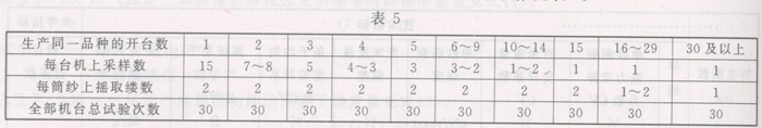 4.4.2氣流紡苧麻棉混紡紗的品等分為優等、一等、二等,低于二等指標者作三等。 4.4.3氣流紡苧麻棉混紡紗的品等由單紗斷裂強力變異系數CV(%)、百米重量變異系數CV(%)和條干均勻度、一克內粒結雜質數等四項評定,當四項品等不同時,按四項中最低一項的品等評定。 4.4.4單紗斷裂強度或百米重量偏差超出允許范圍時,在單紗斷裂強力變異系數CV(%)和百米重量變異系數CV(%)原評等的基礎上作順降一個等處理,如兩項都超出范圍時,亦只順降一次,降至二等為止。 4.4.5檢驗條干均勻度可以由生產廠選用黑板條干均勻度或條干均勻度變異系數CV(%)兩者中的任何一種。但一經確定,不得任意變更。發生質量爭議時,以條干均勻度變異系數CV(%)為準。 4.4.6氣流紡苧麻棉混紡紗重量偏差月度累計,應按產量進行加權平均,全月生產在15批以上的品種,應控制在±0.5%以內。 5試驗方法 5.1試驗條件 5.1.1各項試驗應在各方法標準規定的標準條件下進行。 5.1.2快速試驗:在一般溫濕度條件下進行,不作預調濕平衡,但試驗場所的溫濕度必須穩定。 5.2試驗周期 生產廠可根據各自的具體情況,決定一天或二天試驗一次,作為該周期內紗的分等依據,但周期一經確定,不得任意變更。 5.3取樣 每次取樣15只,是從生產同一品種全部機臺兩側隨機采取筒子紗,作為試樣,采樣時不得固定部位或故意在剛清掃畢紡杯時取,體積大小不夠全部試樣者不取。 5.3.1百米重量變異系數CV(%)、百米重量偏差的取樣數及試驗次數見表5。