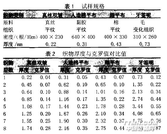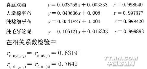 由于這四種織物的相關(guān)系數(shù)都大于0.7649,所以線性關(guān)系均高度顯著。2 分析這四種織物的相關(guān)系數(shù)排列順序?yàn)椋杭兠篮災(zāi)亍⒄娼z雙縐、純棉細(xì)平布、人造棉平布,其中牙簽?zāi)剡h(yuǎn)大于其他織物,真絲雙縐和純棉細(xì)平布相仿,人造棉平布要低些。3 結(jié)論(1)不同織物的克羅值隨著織物層數(shù)(厚度)的增加而增加并且呈線性關(guān)系。(2)單層織物的厚度直接影響到織物克羅值的增加幅度,且各織物的克羅值的差異與厚度呈接近倍數(shù)關(guān)系。設(shè)計保暖性好的服裝面料,厚度是十分重要的。