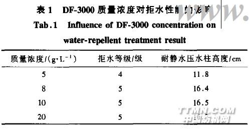 由表1可知,不是拒水整理劑質(zhì)量濃度越高,拒水性能越好。當(dāng)拒水整理劑質(zhì)量濃度大于8 g/L時(shí),提高整理劑質(zhì)量濃度已不能顯著提高非織造布的拒水性能。拒水整理的目的是阻止水對(duì)非織造布表面的潤(rùn)濕,即利用非織造布纖維結(jié)構(gòu)中毛細(xì)管的附加壓力,阻止液態(tài)水通過(guò);但仍要保持非織造布的透氣透濕性能,為此就必須在其表面涂一層低表面能的材料 。當(dāng)拒水整理劑濃度達(dá)到某一特定值時(shí),非織造布表面已經(jīng)形成一層低表面能表面,表面能低于水的表面能,有效阻止了水對(duì)非織造布的潤(rùn)濕,因而拒水效果不會(huì)隨著拒水整理劑質(zhì)量濃度的增大進(jìn)一步提高。2.2 焙烘溫度對(duì)拒水性能的影響用DF.3000配制8 g/L的拒水整理劑處理非織造布,在130—135 qc預(yù)烘3 mirt,再分別在160—165'12、170—175 oC、180—185'12焙烘1 min,測(cè)試其拒水性能,結(jié)果見(jiàn)表2。