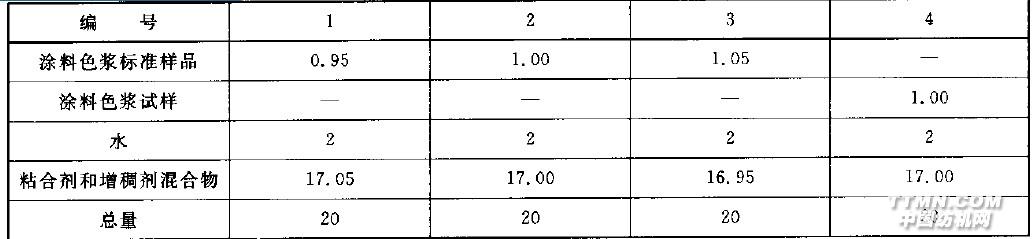 (單位:克)6.1.3 印花操作在 平 整 的玻璃版上鋪好呢氈和襯布(潔凈的紙類亦可),然后將織物(大小與網(wǎng)版所留布樣位置相同)鋪在上面將絹網(wǎng)版按在布樣上,將配制后的涂料色漿標(biāo)準(zhǔn)樣品及試樣分別倒人網(wǎng)版的兩個槽內(nèi),用橡膠刮板將槽內(nèi)色漿按三等分由上刮下,然后取下布樣置于潔凈紙上(為第一版)。再鋪好織物,將網(wǎng)版左右調(diào)換位置,將剩余的色漿分三次刮下,取下布樣置于潔凈紙上(為第二版),置于800C烘箱內(nèi)烘干或晾干。用印花機(jī)印花,參照印花機(jī)的使用說明進(jìn)行。6. 1.4 色光和粉色力的評定按 G B/ T 2374-1994中第6章的規(guī)定進(jìn)行。6.2 顆粒細(xì)度的測定按 HG / T 3400-2001的規(guī)定進(jìn)行,為適應(yīng)涂料色漿的具體特點(diǎn),做以下規(guī)定。a) 放 大倍數(shù)10 00倍(目鏡lox物鏡100);b) 統(tǒng) 一稱取涂料0.5 g (精確至。.0 1g ),配制后立即測定;c) 測 試結(jié)果的表述,以每個視野內(nèi)大于若干(X)微米的顆粒數(shù)表示。X值視具體品種而定。6.3 試驗(yàn)報告試 驗(yàn) 報 告包括以下內(nèi)容:a) 被 測涂料色漿的名稱;b) 測 試項(xiàng)目;c) 本 標(biāo)準(zhǔn)編號、年代號;a) MI 試方法;e) 使 用儀器的名稱、型號;f) 測 試結(jié)果;9) 在 測試過程中的特殊情況;h) 與 本方法的差異;i) 試 驗(yàn)日期。配 漿 時 按表7規(guī)定稱取標(biāo)準(zhǔn)樣品及試樣(精確至。.0 005 g )置于50m L燒杯中,然后移到藥架托盤天平上加水2.0 g,攪拌均勻后再加人按表1配好的粘合劑和增稠劑的混合物(粘合劑和增
