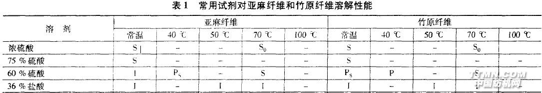由表1可見(jiàn),竹原纖維和亞麻纖維的溶解性能相差不大,沒(méi)有一種試劑能把竹原纖維溶解掉而對(duì)麻纖維損傷不大,或者將麻纖維溶解掉而 對(duì)竹原纖維損傷不大,因此用常規(guī)溶解方法難以滿足定性分析要求。