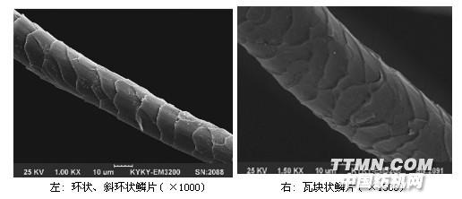 綿羊毛的鱗片多數呈不規則的環狀、斜環狀、大瓦塊狀、龜裂狀。排列分布不均勻,邊緣翹起明顯(見圖1左)。環狀或斜環狀鱗片邊緣相互覆蓋,側面觀察其兩側呈鋸齒狀,大瓦塊狀鱗片彼此覆蓋面積小或根本不覆蓋,邊緣翹起不明顯,鱗片較薄(見圖1右)。