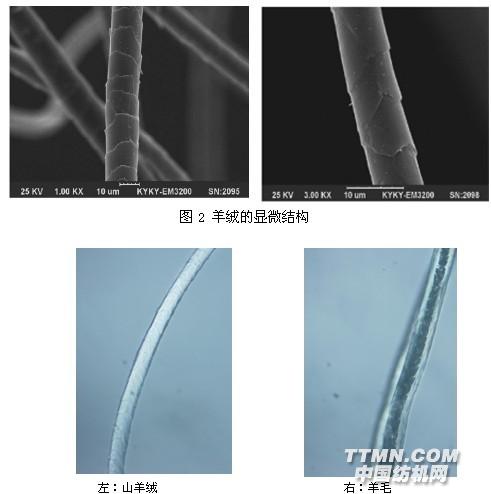 2)羊毛纖維的鱗片排列與羊絨的鱗片相比,緊密且更厚。