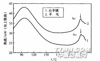 山羊絨、羊毛纖維的WAXD衍射峰強度及DSC熔融燴的比較分析表明:山羊絨纖維的結晶度、α-結晶度均高于羊毛纖維,大分子排列規整性好;羊毛纖維的結晶度、α-結晶度度分別為山羊絨纖維的81.2%及75.8%;山羊絨纖維的玻璃化溫度比羊毛纖維高約5℃,轉化范圍寬約5℃。