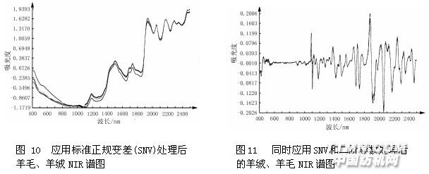 近紅外光譜區域的峰較寬且峰與峰常常重疊,由于羊絨與羊毛具有幾乎相同的化學結構,因此羊絨和羊毛的原始譜圖看起來非常相似。為了消除樣品的不均勻性,首先采用 Vision 軟件提供的標準正規變差(SNV)功能對原始譜圖進行處理,如圖10所示。再對原始譜圖求取二階導數,以降低基線的漂移,強化光譜信號,如圖11所示。隨后建立羊絨、羊毛的數學鑒定模型進行驗證,結果表明[12],此方法對羊絨、羊毛的鑒別基本正確。