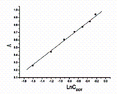 精密配置一系列DDT環己酮標準溶液,用紫外可見分光光度計在273nm處測定其吸光度A,取其濃度的對數LnCDDT,繪制LnCDDT—A曲線。標準曲線如圖2所示。