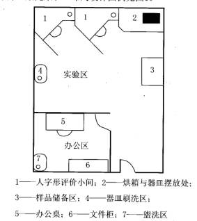 紡織品氣味檢測實驗室采取實驗區和辦公區進行分開設計,辦公區既是數據處理又是檢驗員進行更衣盥洗和適應環境的地方,降低其它氣味對檢測結果的影響;實驗區主要有評價小間、樣品儲備柜、樣品處理區和器皿涮洗區組成,試驗區環境要寬敞,通風效果好,采光柔和。布局設計圖例見圖1。