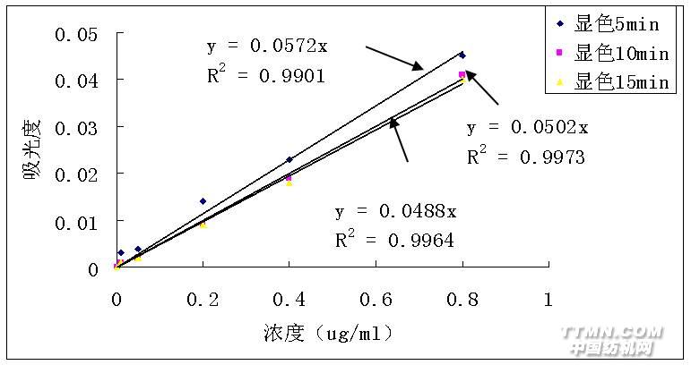 表1是不同顯色時間,不同氯標溶液濃度溶液的吸光度。根據表一繪制不同顯色時間的校正曲線,過零點添加趨勢線(見圖1)。由圖可見,這三個時間獲得的校正曲線線性都較好,其相關系數平方R2分別為0.9901,0.9973,0.9964,但通過互相比較可知在顯色10min至15min時線性更好,特別是在低濃度范圍內。為確保檢測的快速有效,在以下實驗中,我們將顯示時間統一為10min。