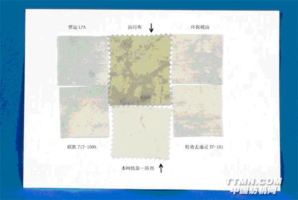 1、測評樣品: A.特效去油靈TF101 (本網) B.環 保 枧 油 (本網) C.低 泡 練 染 一浴劑 (本網) D. 聯勝717-100%環保低泡精練劑 E.雅運多功能乳化分散劑LPA 2、測試方法及大致過程: 測試助劑對油污去除效果,油污布樣來自于織布廠,上面有老化、破乳的針織油,有設備潤滑油(擦過設備),有黑色皮鞋油(擦過皮鞋);處理工藝:同比進行,用不同的去油助劑2g/L,98℃×20′,熱洗一次,水洗烘干;然后用電腦測配色測定白度值; 3、結果: (布樣圖片、白度值):助劑 白度值 空白污布樣 45.56 A特 效 去 油 靈TF101 (本網) 57.89 B環 保 枧 油 (本網) 56.74 C低 泡 練 染 一浴劑 (本網) 59.33 D聯勝717-100%環保低泡精練劑 56.86 E雅運多功能乳化分散劑LPA 54.18