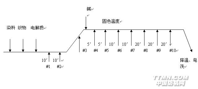 一、上染曲線和固色曲線方法 1、實驗原理 活性染料在上染過程的行為,可以通過上染曲線和固色曲線來描述。組分染料的上染曲線和固色曲線的類型相同或相似,則說明這些染料在上染過程中的行為相似或相近,因此應該有較好的配伍性。 2、試驗方法 將待選擇的活性染料配成溶液后,取一定濃度,配成11個相同濃度的染浴并編號。其中一個空白染浴,即不加織物,編號為0。按本公司的標準工藝條件進行染色和固色,在不同的時間取出各樣品.。(下圖為曲樣品時間點)