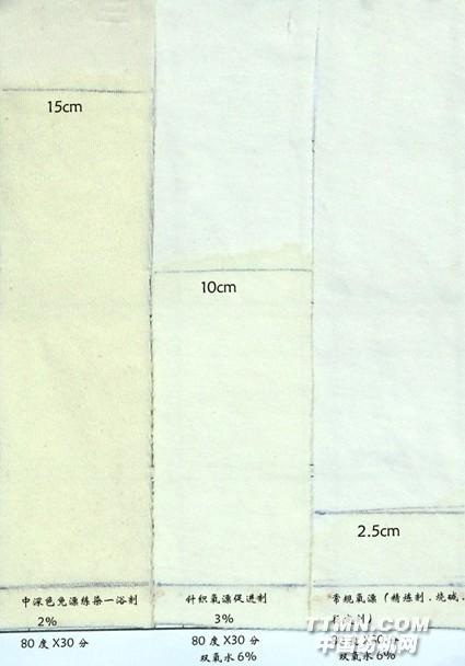 實驗方法: 1.中深色練染一浴劑實驗工藝:80℃×30min,水洗三次,晾干測試毛效; 2.針織氧漂促進劑試驗方法:與常規氧漂工藝在80度做對比實驗,測試白度和毛效指標: 常規氧漂工藝:雙氧水6.0%、低泡精煉劑LFD 1.0%、氧漂穩定劑0.5%,30%液體燒堿5.0%,;80℃×30min 針織氧漂促進劑工藝:雙氧水6.0%、針織氧漂促進劑3.0%;80℃×30min; 3.結果:白度、毛效 毛效圖片