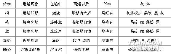 1、鑒別方法:①鑒別的方法有手感、目測(cè)法、燃燒法、顯微鏡法、溶解法、藥品著色法以及紅外光譜法等。在實(shí)際鑒別時(shí),常常需要用多種方法,綜合分析和研究以后得出結(jié)果。②一般的鑒別步驟如下:A. 首先用燃燒法鑒別出天然纖維和化學(xué)纖維。B. 如果是天然纖維,則用顯微鏡觀察法鑒別各類(lèi)植物纖維和動(dòng)物纖維。如果是化學(xué)纖維,則結(jié)合纖維的熔點(diǎn)、比重、折射率、溶解性能等方面的差異逐一區(qū)別出來(lái)。C. 在鑒別混合纖維和混紡紗時(shí),一般可用顯微鏡觀察確認(rèn)其中含有幾種纖維,然后再用適當(dāng)方法逐一鑒別。D. 對(duì)于經(jīng)過(guò)染色或整理的纖維,一般先要進(jìn)行染色剝離或其它適當(dāng)?shù)念A(yù)處理,才可能保證鑒別結(jié)果可靠。 2、 常見(jiàn)纖維的燃燒性質(zhì):