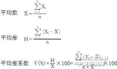(1) 式中,Xi為各次試驗值。 平均差系數(shù)也可用紗密爾公式(德國H.Sommer提出)計算,其公式為: