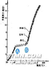 由圖得到溫度與失重間關系曲線,表明羊毛纖維具有類合成纖維的特征,但其轉變溫度的范圍較寬,故其既具有玻璃化 溫度,但又有較寬的溫度轉換區域,由圖給出的A-B溫度在80-160℃之間,可作為羊毛整理的溫度區間當溫度繼續升至220~230℃,又出現熱收縮應力的第二個峰,這與羊毛纖維內部分子排列整齊區域有關,在此溫度下,外界能量足以使整齊區域分子鏈段改變構象,如分子結構向a-螺旋鏈分子結構轉變等,微觀結構的改變,則在宏觀方面表現為收縮應力的增加 ;對羊毛織物整理而言,熱松弛溫度,對毛織物后整理加工和熱定形溫度選擇,具有一定實用意義。