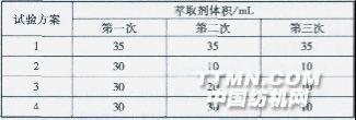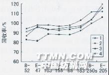 圖2體積單因子試驗(yàn) 由圖2可見,方案2的萃取效果最差,而方案1、3、4的萃取效果接近。因此,采用的試驗(yàn)方案為:第一次萃取劑體積為30 mL,第二次20 mL,第三次10 mL,即可用較少的溶劑體積得到較滿意的試驗(yàn)結(jié)果。2.2氣相色譜測定條件的確立 在8種PBBs和PBDEs混合物的氣相色譜分析方法研究中,由于四溴聯(lián)苯醚和五溴聯(lián)苯在HP-5毛細(xì)柱上具有相同的保留時(shí)間,同時(shí)八溴聯(lián)苯和八溴聯(lián)苯醚屬于高溴取代物,沸點(diǎn)高,較難出峰。因此,要使E-47和B-103獲得滿意的分離,以及使B-250s和E-205出峰,是本測試的兩大難題。研究發(fā)現(xiàn),較低的載氣流速和較低的溫度對分離E-47和B-103有利;另一方面,較高的流速和溫度有利于B-250s和E-205的出峰。圖3顯示了E-47和B-103在不同載氣流速條件下的分離情況。.jpg)