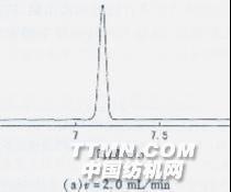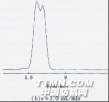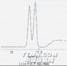 圖3不同載氣流速條件下E-47和B-103的分離 由圖3可見,流速的降低對分離E-47和B-103有利。根據(jù)式(1)分離摩計(jì)算公式: