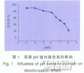 固定攪拌時間為8 min、離心時間為10 min、投土量為20 g/L,改變溶液pH值,按1.3節的方法處理染料廢水,考查不 同溶液pH值對脫色效果的影響。結果見圖1。