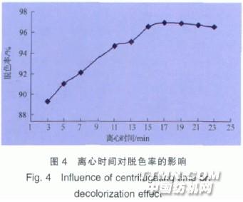 由圖4可知,隨著離心時間的增加,脫色率增大;當離心 時間達到17 min后,脫色率不隨離心時間的變化而變化,基 本趨于穩定狀態。本試驗最佳離心時間為17 min。