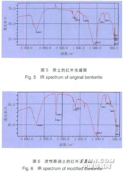 改性殼聚糖膨潤土能夠明顯提高原土對酸性大紅染料 的吸附能力。試驗結果表明,當pH值為4,攪拌6 min,投土 量14 g/L,離心17 min時,改性殼聚糖膨潤土處理酸性大紅 染料廢水效果最佳,脫色率可達到97%。改性土性能表征結 果表明,改性土的比表面積增大,殼聚糖的酰胺結構明顯負 載到膨潤土中,但是改性并未改變原土的基本結構,只是提 高了原土的吸附能力。鑒于中國膨潤土資源十分豐富,礦產 儲量僅次于美國,居世界第二位,加強和加快這種廉價膨潤 土資源的開發應用,具有極其重要的