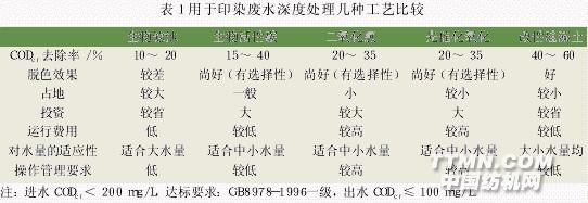 據南京嘉慶科技實業有限公司在多家綜合性印染廠運行入硅藻土凈水設備,將經生化處理后的廢水(CODcr為140 ~ 210 Mg/L)進入硅藻土凈水設備,出水CODcr 為60 ~ 90 Mg/L,去除率為40 % ~ 66.6 %,這是一般物化工藝很難達到的。印染廢水經過系列處理后,最后余下的污染物很難降解,一般深度處理工藝的CODcr 去除率<30 %。對幾種印染廢水深度處理工藝的效果進行比較,結果如表1所示。