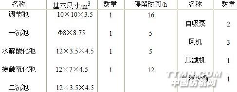 1 廢水處理工藝、主要構筑物及設備 1.1 廢水水質 以義烏市某印染廠為研究對象。該廠主要從事織物和纖維包括棉、絲和化纖等的印染。使用的漿料有分散染料、硫化染料、陽離子染料和直接染料,其中分散染料和硫化染料的量比較大。正常生產時廢水排放量約500 m3/d,水質指標為:pH=8~10,CODCr<1500 mg/L,SS<500 mg/L,色度<1000倍。廢水中CODCr及色度較高。設計出水水質達到國家《紡織染整工業水污染物排放標準》(GB4287-92)一級標準即pH=6~9,CODCr=100 mg/L,SS=70 mg/L,色度=40倍。 1.2 工藝流程 該處理工藝充分考慮到水質的特點,強調處理工藝的脫色率以及提高有機污染物的去除效果。為此確定的工藝流程如下: 1.3 主要構筑物和主要設備(見表1)。 表1 主要構筑物和主要設備