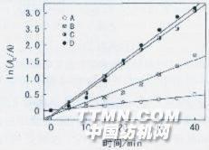 2.3溶液pH值的影響 在輻射光條件下,使用0.50g羊毛纖維鐵配合物(Cfe-wool=32.48 mg/g)分別對不同pH值的兩種染料溶液進(jìn)行氧化降解反應(yīng),其降解反應(yīng)速率常數(shù)及相關(guān)系數(shù)R見表4,ln(A。/A)與t的關(guān)系如圖4所示。 表4 pH值與染料氧化降解反應(yīng)速率常數(shù)之間的關(guān)系.jpg)
