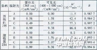 (a)活性紅195 (b)酸性黑234圖3 不同輻射光強(qiáng)度下的染料降解動力學(xué)曲線表3輻射光強(qiáng)度對染料氧化降解反應(yīng)的影響