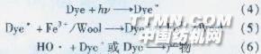 由圖3和表3知,ln(A。/A)與t保持了良好的線性關(guān)系,相關(guān)系數(shù)均接近于1,并且不受輻射光強(qiáng)度變化的影響。 表3還顯示,隨輻射光強(qiáng)度的增加,兩種染料的降解反應(yīng)速率常數(shù)均逐漸增加。這說明羊毛纖維鐵配合物對染料氧化降解反應(yīng)的催化作用與輻射光強(qiáng)度之間存在明顯的正相關(guān)性。其可解釋為,輻射光能夠促進(jìn)吸附于配合物表面的染料被激發(fā)成Dye*并釋放出電子,加速了Fe3+/Fe2+的催化循環(huán)反應(yīng),進(jìn)而產(chǎn)生更多的HO·,加快了染料的氧化降解,提高了降解反應(yīng)速率常數(shù),反應(yīng)式(4)、(5)和(6)描述了可能的反應(yīng):