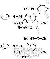 1 染色原理 活性染料水解后的母體結(jié)構(gòu)與酸性染料非常相似,如活性艷紅X—3B和酸性紅G的結(jié)構(gòu)如下: