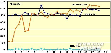 工程簡介:該工程屬于改建項目,原設施設計的目的是去除COD,現在增加了硝化和反硝化處理,通過計算如果總氮負荷Lv >0.6 kgN/m3xd,硝化過程穩定。采用傳統的活性污泥法和類似工藝,如要到達穩定的硝化F:M比至少為70g N/kg MLSS xd,相應的總氮負荷Lv 為0.3-0.35 kgN/m3xd,明顯比設計值要小。如果采用以LEVAPOR® 懸浮填料為載體的流化床工藝,則完全滿足上述設定的參數。處理結果如下圖所示,工程達到預期的目的。