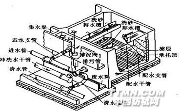 過濾池采用半地埋式鋼混結(jié)構(gòu),濾池結(jié)構(gòu)如圖所示,濾池外部由濾池池體、進(jìn)水管、出水管、沖洗水管、沖洗水排出管等管道及其附件組成;濾池內(nèi)部由沖洗水排出槽、進(jìn)水渠、濾料層、墊料層(承托層)、排水系統(tǒng)(配水系統(tǒng))組成。該池的設(shè)計參數(shù):1:停留時間HRT=2.40h2:有效容積V=520m3 衰減負(fù)荷2.0m3/(m2·h), 3:外型尺寸12.0m×7.5m×5.0m
