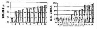 同其它工業廢水處理一樣,印染廢水催化裂解處理工程的沉淀池、污泥濃縮池的顆粒沉降曲線的測定是沉淀池設計的基礎。在調節池前設置機械格柵用來去除大塊懸浮物與漂浮物,保證管道、閥門及泵的通暢無阻。沉砂池預先除砂,防止沉淀池和配水渠道內積砂,污泥泵堵塞、磨損。為防止沉砂中夾帶有機物,引起后續處理上的麻煩,常采用曝氣沉砂池。一、二級沉淀池中,采用折流沉淀,安裝污泥回流裝置。不加混凝劑。懸浮固體及BOD的去除率如圖所示。