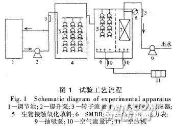 1 材料與方法 1.1 試驗工藝 試驗采用水解酸化+SMBR工藝處理印染廢 水,設計水量為5 m3/d。印染廢水經水解酸化預處 理后進入SMBR進行處理。試驗工藝流程見圖1。