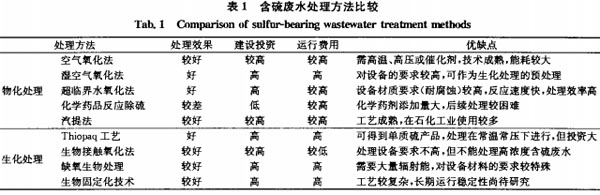 在處理方法的選擇上,應針對不同性質的含硫廢水,采用不同的處理工藝,工程中常常將不同的處理工藝聯合使用。表1對幾種常用及處于研究階段的含硫廢水處理方法進行了比較總結。