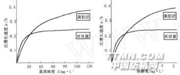 圖1 兩類微生物比增長速率與基質濃度/DO的關系另外,關于污泥膨脹的理論還有A /V假說、饑餓假說理論和積累—再生假說理論等等。2 污泥膨脹類型活性污泥系統中的微生物處于動態平衡之中,理想的污泥絮體沉降性能良好,絲狀菌和菌膠團之間相互競爭,相互依存,絮體中存在的絲狀菌有利于保護絮體已經形成的結構并能增加其強度。但是在污泥膨脹誘因的誘發下就容易發生污泥膨脹。污泥膨脹可以分為兩大類:絲狀菌膨脹和非絲狀菌膨脹。前者是由于活性污泥中大量絲狀菌繁殖而造成的,大量的絲狀菌從污泥絮體中伸出很長的菌絲體,菌絲體之間互相接觸,起到架橋作用,從而形成了一個框架結構,支撐著污泥絮體,阻止了絮體的有效沉降。后者是由于菌膠團在特定的環境條件下分泌并積累大量高粘性物質,而高粘性物質的結合水高達380%,從而造成污泥比重減輕,壓縮性能惡化而引起膨脹。