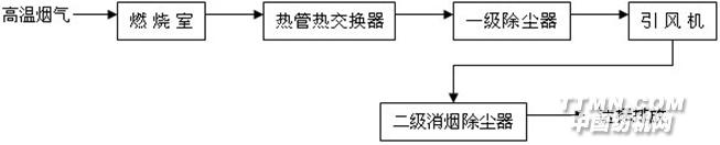 一、基本原理(見示意圖)原理:高溫?zé)煔庀冉?jīng)過燃燒室,使一氧化碳和碳?xì)浠衔锍浞秩紵?,然后進(jìn)入熱管熱交換器,將煙氣中的熱量提取出來,使其溫度降至150℃以下,當(dāng)進(jìn)入一級除塵器時,既繼續(xù)降溫又去除85%的煙塵,進(jìn)入引風(fēng)機時,煙氣溫度已降至100℃以下。