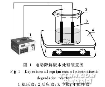 近年來,來自于印染紡織企業染料廢水排放已 經對水域環境產生了嚴重的危害。調研證實,染料 廢水主要來自于中、小型紡織、印染企業,因而其具 有分布相對分散、集中處理難以進行的特點。除此 之外,由于中、小型紡織、印染企業在染色工程中使 用大量的分散劑、媒染劑等助劑,使得染料廢水的可 生化性明顯降低。因此,探索和研究新型染料廢水 處理技術是我國環境領域當前急需解決的難題 之一。目前,針對印染廢水處理的研究主要集中在物 理吸附、化學試劑氧化、膜處理、光催化氧化以及微 生物降解處理等技術。孫德帥等[1-2]研究了粉煤灰 對活性染料、酸性染料、陽離子染料廢水的吸附脫色 處理,效果很好,但吸附劑再生及其后處理有一定的 難度。Fenton試劑法可以較好的氧化某些特定的染 料,可局部的推廣,但成本較高[3]。采用膜技術對 染料廢水的脫色處理取得好的效果[4-5],但是國內在 膜技術的研究和應用上仍存在困難。生化分解法能 有效的分解廢水中的有機高分子,但因為廢水本身 的毒性,對微生物有殺傷作用,這也抑制了該方法取 得更佳的效果[6]。光催化氧化法和超聲降解技術 則還處在研究初期,但前景被普遍看好[7]。總而言 之,針對染料廢水的毒物種類多、色度高、污染大的 特點,開發和研究新的染料廢水處理途徑在當前還 是具有鮮明的理論價值和應用意義[8-9]。 本研究旨在開發利用電動降解技術來處理酸性品紅廢水。實驗主要考察電動降解技術處理酸性品 紅廢水的工藝條件,分析降解的機理等。