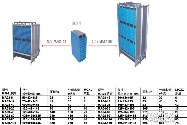 MicroClear®超濾膜組件可以有非常多的組合方式,既可以并排也可以重疊地堆放。MA03系列組件(膜元件的兩層堆放)是為較淺的反應池設計的(水深1.8米),例如集裝箱反應池。如果反應池比較深(水深超過 2.3米)最適合采用MA04系列。膜元件三層堆放,優點是所需空間小,曝氣更有效率。