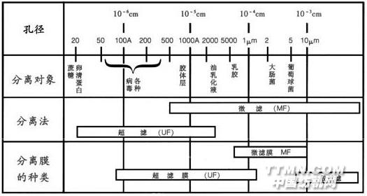超濾與微濾分離范圍比較 在水處理領(lǐng)域中,超濾技術(shù)可以除去水中的細(xì)菌、病毒、熱源和其它膠體物質(zhì),因此用于制取電子工業(yè)超純水、醫(yī)藥工業(yè)中的注射劑、各種工業(yè)用水的凈化以及飲用水的凈化。在食品工業(yè)中,乳制品、果汁、酒、調(diào)味品等生產(chǎn)中逐步采用超濾技術(shù),如牛奶或乳清中蛋白和低分子量的乳糖與水的分離,果汁澄清和去菌消毒,酒中有色蛋白、多糖及其它膠體雜質(zhì)的去除等,醬油、醋中細(xì)菌的脫除,較傳統(tǒng)方法顯示出經(jīng)濟(jì)、可靠、保證質(zhì)量等優(yōu)點(diǎn)。在醫(yī)藥和生物化工生產(chǎn)中,常需要對熱敏性物質(zhì)進(jìn)行分離提純,超濾技術(shù)對此顯示其突出的優(yōu)點(diǎn)。用超濾來分離濃縮生物活性物(如酶、病毒、核酸、特殊蛋白等)是相當(dāng)合適的從動、植物中提取的藥物(如生物堿、荷爾蒙等),其提取液中常有大分子或固體物質(zhì),很多情況下可以用超濾來分離,使產(chǎn)品質(zhì)量得到提高。在廢水處理領(lǐng)域,超濾技術(shù)用于電鍍過程淋洗水的處理是成功的例子之一。在汽車和家具等金屬制品的生產(chǎn)過程中,用電泳法將涂料沉積到金屬表面上后,必需用清水將產(chǎn)品上吸著的電鍍液洗掉。洗滌得到含涂料1~2%的淋洗廢水,用超濾裝置分離出清水,涂料得到濃縮后可以重新用于電涂,所得清水也可以直接用于清洗,即可實現(xiàn)水的循環(huán)使用。目前國內(nèi)外大多數(shù)汽車工廠使用此法處理電涂淋洗水。超濾技術(shù)也可用于紡織廠廢水處理。紡織廠退漿液中含有聚乙烯醇(PVA),用超濾裝置回收PVA,清水回收使用,而濃縮后的PVA濃縮液可重新上漿使用。隨著新型膜材料(功能高分子、無機(jī)材料)的開發(fā),膜的耐溫、耐壓、耐溶劑性能得以大幅度提高,超濾技術(shù)在石油化工、化學(xué)工業(yè)以及更多的領(lǐng)域應(yīng)用將更為廣泛。