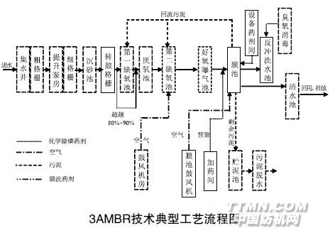 1 3AMBR技術特點及運行效果強化除磷脫氮膜生物反應器工藝(3AMBR工藝,Anoxic Anaerobic Aerobic -MBR 工藝)是將膜生物反應器技術與傳統的厭氧、缺氧、好氧工藝結合的新工藝,使MBR工藝的突出特點與生物除磷脫氮過程相互促進,使整個系統除磷脫氮和去除有機物的效率達到最大化效果。3AMBR技術典型工藝流程見下圖。
